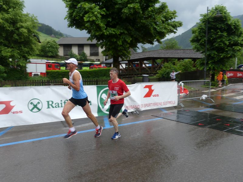 Doch nun, als Georg und Clemens am Start waren, öffnete der Himmel die Schleusen und es schüttete wie aus Schaffeln, sogar leichter Hagel war dabei. Die Straßen und Plätze von Sarnthein glichen eher einem See. Sogar der VSS-Zielbogen saufte ab und so kam es zu den legendären Zielsprung beim Zieleinlauf. Ein Vorteil hatte der Regen: Georg und Clemens bekamen eine Gratisdusche während dem Lauf. Clemens erreichte davon unbeeindruckt den überragenden dritten Platz und Georg holte mit seinem 5. Platz erneut einen Top 10 Platz.